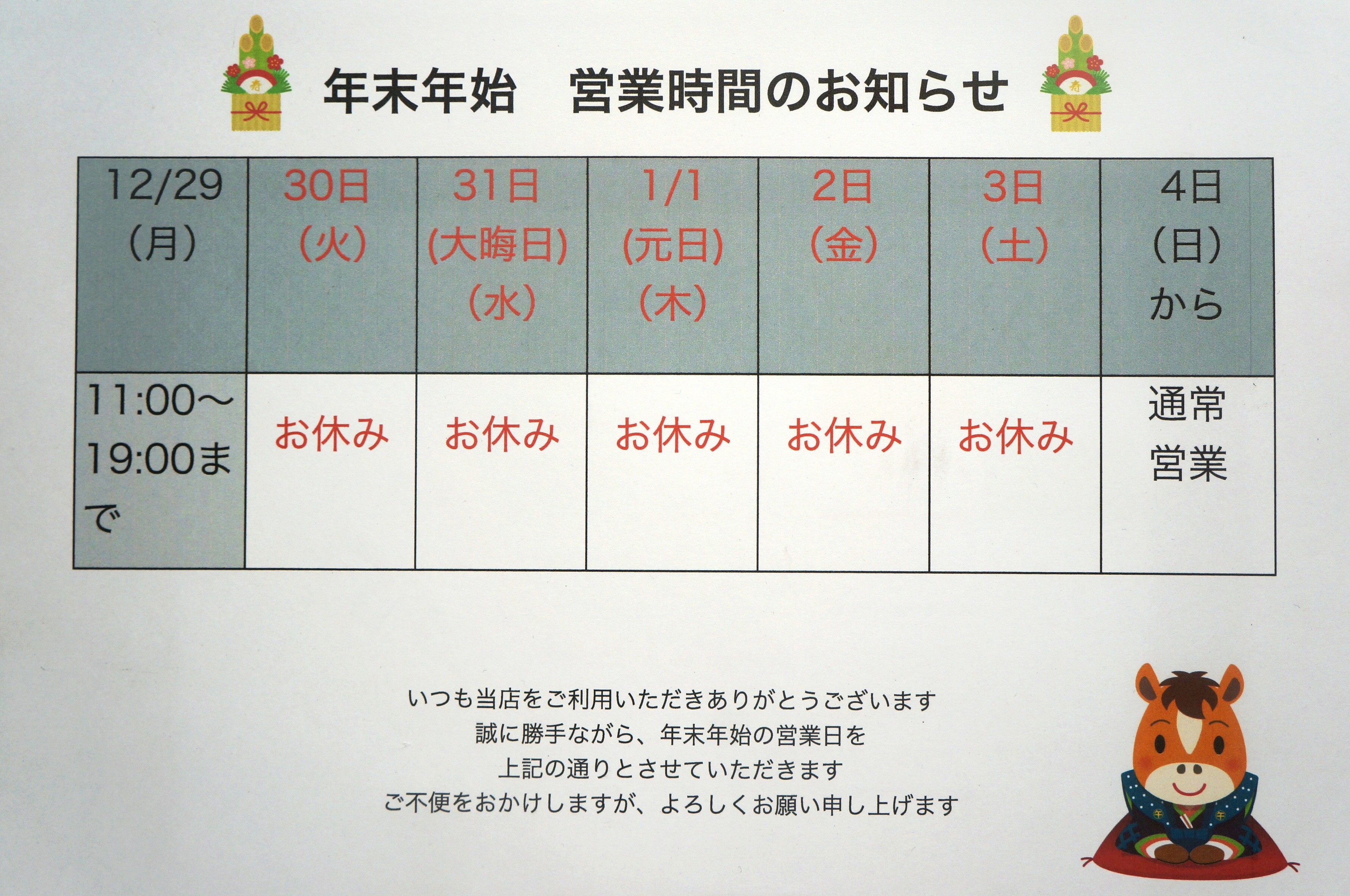 12月29日(月)通常営業 (11:00~19:00)