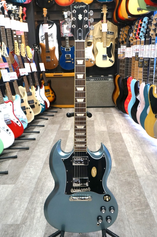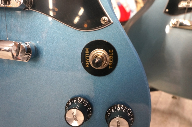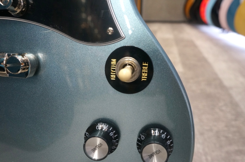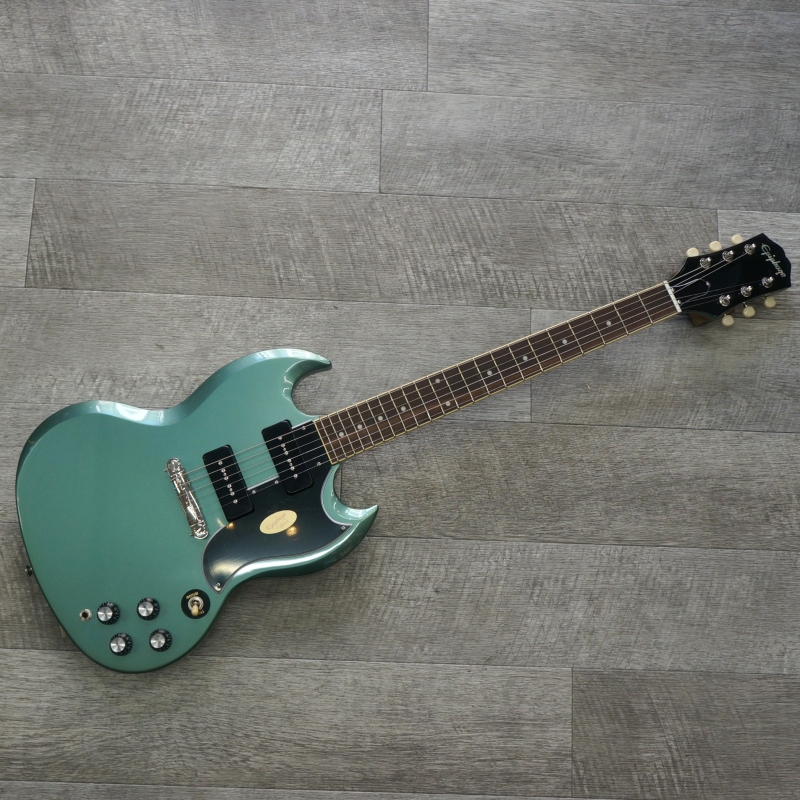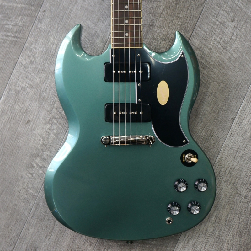 実はこちらも入荷しています!緑色っぽく見えますが、見ようによっては青色ですかね。経年によって変色した個体を再現したものと思われます。フェイデッドのペルハムブルー、絶妙な感じが渋いです。こちらはSGスペシャルなので、ポジションマークがドットだったり、ヘッドにはクラウンインレイが無いですね。P90シングルコイル搭載でスモールピックガード仕様。この組み合わせもお好きな方多いですよね。SGスペシャルはどうしてもピート・タウンゼントが思い浮かびます。